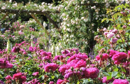 Fabulous scents from old fashioned roses trail walls, pergolas, arches and abound everywhere. Other plants intermingle giving a fantastic picture of intense colours.