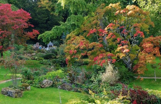 This Indian style garden at Sezincote surrounds a grand house built in 1810. It is reminiscent of the Brighton Dome. The garden follows a stream which tumbles down the hill-side and has amazing Autumn colours.House also open.
